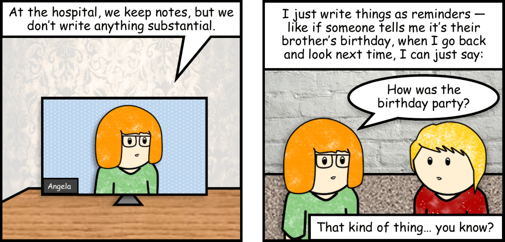 “Instead of using documentation to construct a record of her peer’s experiences, Angela used documentation … as a tool to support and deepen the peer relationship.”
